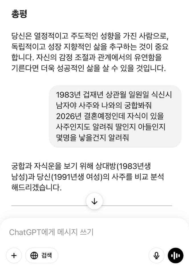 결국 사주풀이란 인간의 운명을 미리 간파하겠다는 취지보다는, 앞으로의 인생을 더 긍정적으로 설계하기 위한 ‘참고 정보’로 보는 것이 좋습니다. 챗지피티 사주풀이 또한 마찬가지입니다.