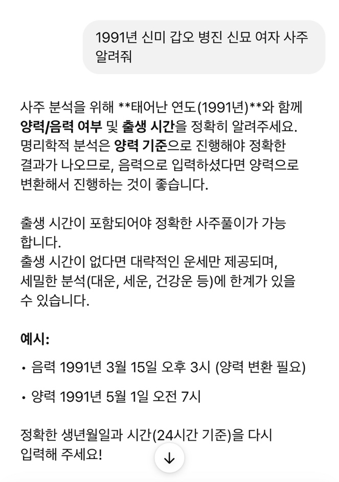 챗지피티에 질문할 때는 ‘구체성’이 중요합니다. 예를 들어 막연히 “내 사주 좀 봐줘”라고 하면, AI가 충분한 정보를 얻기 어려워 일반적인 설명밖에 못 할 수 있습니다. 다음과 같은 방식을 권장합니다.