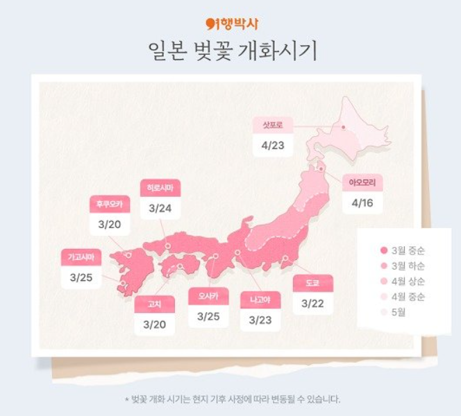 일본은 지역별 개화 시기가 좀 더 길게 지속되는 특징이 있으며, 특히 홋카이도 지역은 4월 말~5월 초까지도 벚꽃을 볼 수 있어요.