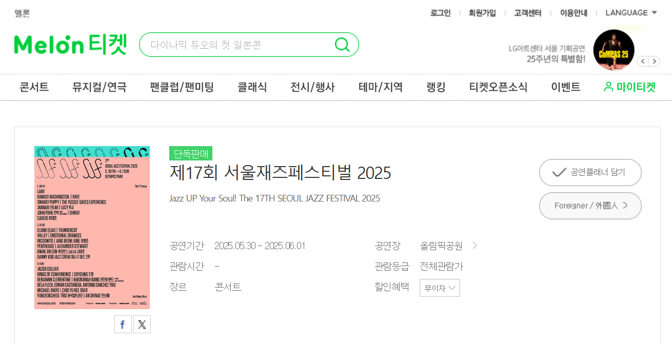 2025 서울재즈페스티벌 티켓팅은 2월 27일(화) 낮 12시부터 시작되며, 예매는 멜론티켓을 통해 진행됩니다.
